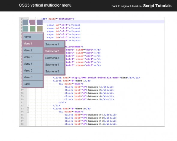 <div class="container"> <span id="clr1"></span> <span id="clr2"></span> <span id="clr3"></span> <span id="clr4"></span> <span id="clr5"></span> <span id="clr6"></span> <div class="colorScheme"> <a href="#clr1" class="clr1"></a> <a href="#clr2" class="clr2"></a> <a href="#clr3" class="clr3"></a> <a href="#clr4" class="clr4"></a> <a href="#clr5" class="clr5"></a> <a href="#clr6" class="clr6"></a> </div> <ul id="nav"> <li><a href="http://www.script-tutorials.com/">Home</a></li> <li><a href="#">Menu 1</a> <ul class="subs"> <li><a href="#">Submenu 1</a></li> <li><a href="#">Submenu 2</a></li> <li><a href="#">Submenu 3</a></li> <li><a href="#">Submenu 4</a></li> <li><a href="#">Submenu 5</a></li> </ul> </li> <li><a href="#">Menu 2</a> <ul class="subs"> <li><a href="#">Submenu 2-1</a></li> <li><a href="#">Submenu 2-2</a></li> <li><a href="#">Submenu 2-3</a></li> <li><a href="#">Submenu 2-4</a></li> <li><a href="#">Submenu 2-5</a></li> <li><a href="#">Submenu 2-6</a></li> <li><a href="#">Submenu 2-7</a></li> <li><a href="#">Submenu 2-8</a></li> </ul> </li> <li><a href="#">Menu 3</a> <ul class="subs"> <li><a href="#">Submenu 3-1</a></li> <li><a href="#">Submenu 3-2</a></li> <li><a href="#">Submenu 3-3</a></li> <li><a href="#">Submenu 3-4</a></li> <li><a href="#">Submenu 3-5</a></li> </ul> </li> <li><a href="#">Menu 4</a></li> <li><a href="#">Menu 5</a></li> <li><a href="#">Menu 6</a></li> <li><a href="http://www.script-tutorials.com/css3-vertical-multicolor-3d-menu/">Back</a></li> </ul> </div>
