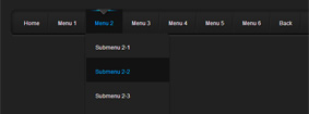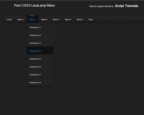 <ul id="nav"> <li><a href="http://www.script-tutorials.com/">Home</a></li> <li><a class="hsubs" href="#">Menu 1</a> <ul class="subs"> <li><a href="#">Submenu 1</a></li> <li><a href="#">Submenu 2</a></li> <li><a href="#">Submenu 3</a></li> <li><a href="#">Submenu 4</a></li> <li><a href="#">Submenu 5</a></li> </ul> </li> <li><a class="hsubs" href="#">Menu 2</a> <ul class="subs"> <li><a href="#">Submenu 2-1</a></li> <li><a href="#">Submenu 2-2</a></li> <li><a href="#">Submenu 2-3</a></li> <li><a href="#">Submenu 2-4</a></li> <li><a href="#">Submenu 2-5</a></li> <li><a href="#">Submenu 2-6</a></li> <li><a href="#">Submenu 2-7</a></li> <li><a href="#">Submenu 2-8</a></li> </ul> </li> <li><a class="hsubs" href="#">Menu 3</a> <ul class="subs"> <li><a href="#">Submenu 3-1</a></li> <li><a href="#">Submenu 3-2</a></li> <li><a href="#">Submenu 3-3</a></li> <li><a href="#">Submenu 3-4</a></li> <li><a href="#">Submenu 3-5</a></li> </ul> </li> <li><a href="#">Menu 4</a></li> <li><a href="#">Menu 5</a></li> <li><a href="#">Menu 6</a></li> <li><a href="http://www.script-tutorials.com/pure-css3-lavalamp-menu/">Back</a></li> <div id="lavalamp"></div> </ul>