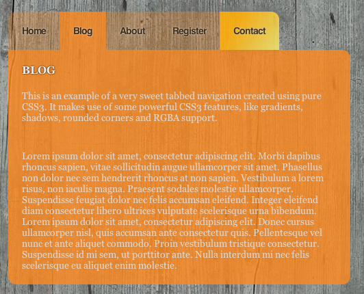 С помощью CSS3 у Вас есть возможность создавать градиенты. В этом примере мы используем простой линейный двухцветный градиент, но возможности бесконечны. Вы можете воспользоваться этим прекрасным инструментом создания градиентов CSS3, как сделали мы, чтобы облегчить себе создание градиентов CSS. Мы также добавили светло-серую тень сверху, чтобы усилить эффект трехмерности вкладок.