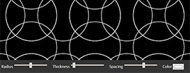 Можно увидеть эти эффекты, использовав ползунки ниже. Особенно интересно использовать изменение расстояний, которое меняет значение перемещения для копий исходного элемента круга, и изменение размера, которое меняет величину элемента узора, всегда оставляя исходный элемент круга в центре.