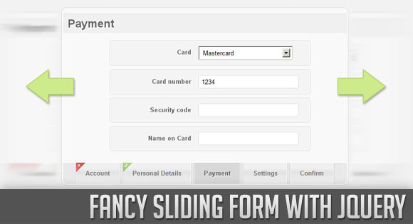 <h1>Fancy Sliding Form with jQuery</h1> <div id="wrapper"> <div id="steps"> <form id="formElem" name="formElem" action="" method="post"> <fieldset class="step"> <legend>Account</legend> <p> <label for="username">User name</label> <input id="username" name="username" /> </p> <p> <label for="email">Email</label> <input id="email" name="email" type="email" /> </p> <p> <label for="password">Password</label> <input id="password" name="password" type="password" /> </p> </fieldset> <fieldset> ... </fieldset> </form> </div> <div id="navigation" style="display:none;"> <ul> <li class="selected"> <a href="#">Account</a> </li> <li> <a href="#">Personal Details</a> </li> <li> <a href="#">Payment</a> </li> <li> <a href="#">Settings</a> </li> <li> <a href="#">Confirm</a> </li> </ul> </div> </div>