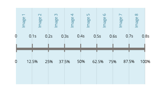 Проценты анимации вычисляются следующим образом: возьмем 100% времени анимации и распределим в нем 8 изображений. Каждое изображение показывается в течение 0.1 секунды, что означает, что мы хотим, чтобы следующее изображение показывалось на 12.5%. Второе изображение, которое будет показано, будет находится поверх текущего, хотя у них будет одинаковое значения свойства z-index, так как это изображение — следующее в структуре HTML. Мы также пробовали другие возможные варианты, чтобы не использовать свойство  z-index, например назначить 12,6% следующим шагом и т. п., но на наш взгляд, этот вариант работает наиболее плавно. Тем не менее, иногда возможно подтормаживание.