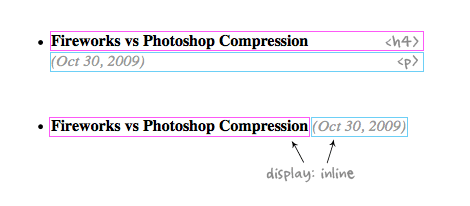 .block em { display: block; } .inline h4, .inline p { display: inline; }