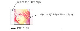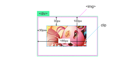 .clip { position: relative; height: 130px; width: 200px; border: solid 1px #ccc; } .clip img { position: absolute; clip: rect(30px 165px 100px 30px); }