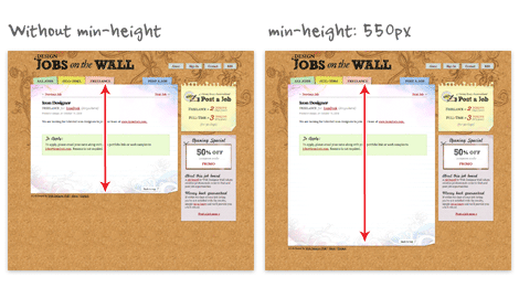 Свойство min-height позволяет задать минимальную высоту элемента. Оно полезно, когда Вам нужно выравнять разметку. Мы используем его, например, чтобы область содержимого всегда была длиннее, чем боковой столбец.