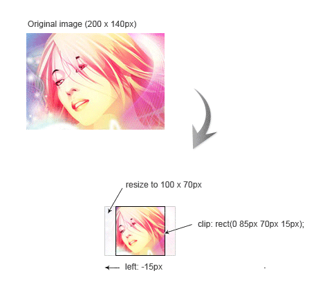 .gallery li { float: left; margin: 0 10px 0 0; position: relative; width: 70px; height: 70px; border: solid 1px #000; } .gallery img { width: 100px; height: 70px; position: absolute; clip: rect(0 85px 70px 15px); left: -15px; }