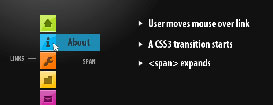 Свойство перехода CSS3 предоставляет много возможностей. Оно позволяет анимировать изменения, происходящие в элементе, когда применяются псевдоклассы. В частности в нашем примере, когда пользователь наводит указатель мыши на ссылку меню, псевдокласс :hover начинает действовать, показывая тег span, который спрятан в других ситуациях.