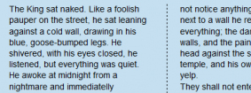<!DOCTYPE html> <html lang="en" > <head> <meta charset="utf-8" /> <title>Multi-columns with CSS3 | Script Tutorials</title> <link href="css/main.css" rel="stylesheet" type="text/css" /> <script type="text/javascript" src="js/jquery-1.5.2.min.js"></script> <script type="text/javascript" src="js/script.js"></script> </head> <body> <div class="controls"> <input type="button" id="more_cols" value="More columns" /> <input type="button" id="less_cols" value="Less columns" /> <input type="button" id="more_gap" value="More gap" /> <input type="button" id="less_gap" value="Less gap" /> </div> <div class="container" id="container"> <p>The King sat naked. Like a foolish pauper on the street, he sat leaning against a cold wall, drawing in his blue, goose-bumped legs. He shivered, with his eyes closed, he listened, but everything was quiet.</p> <p>He awoke at midnight from a nightmare and immediatelly understood that he was finished. Some one weezed and writhed by the door of the bedroom suite, he heard footsteps, metalic jingling and drunken mummbling of His Highness, Uncle Buht: "Let me through... Let me.. Break it down, hell with it..." Wet with icy sweat, he slintly rolled off his bed, ducked into a secter closet, and loosing himself he ran down the underground passage. Something sqelched under his bare feet, the startled rats dashed away, but he did not notice anything, just now, sitting next to a wall he remembered everything; the darkness, the slippery walls, and the pain from a blow on the head against the shakled door to the temple, and his own unberable high yelp.</p> <p>They shall not enter here, he thought. No one shall enter here. Only if the King order's so. But the King shall not order... He snickered hysterically. Oh no, the King will not order! He carefully un screwed up his eyes and saw his blue, hairless legs with scraped knees. Still alive, he thought. I will live, because they shall not enter here.</p> <p>Everything in the temple was blueish from the cold light of the lanterns -- long glowing tubes that were stretched under the ceiling. In the center, God stood on an eminence, big, heavy, with sparkling dead eyes. The King continuously and stupidly stared, until God was suddenly screened by a shabby lay brother, still a greenhorn. Scraching, with an open mouth he gazed at the naked King. The King squinted once again. Scum, he thought, a lousy vermine, catch the mongrel and to the dogs, for them to ravage... He reasoned that he did not remember the lout well, but he was long gone. So scrawny, snotty... That's all right, we'll remember. We'll remeber everything, Your Highness, Uncle Buht. During the father's reighn, I dare say you sat quietly, drank a bit and kept silent, were afraid to be noticed, you knew that King Prostyaga did not forget you ignoble treachery...</p> </div> <footer> <h2>Multi-columns with CSS3</h2> <a href="http://www.script-tutorials.com/how-to-do-multi-columns-with-css3/" class="stuts">Back to original tutorial on <span>Script Tutorials</span></a> </footer> </body> </html>