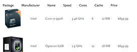 <table> <thead> <tr> <th>Package <th>Manufacturer <th>Name <th>Speed <th>Cores <th>Cache <th>Price <tfoot> <tr> <td colspan=6> <tbody> <tr> <td><img src=amd-opteron.jpg alt="AMD Opteron 6172 Twelve-Core 2.1GHz"> <td>AMD <td>Opteron 6172 <td>2.1 GHz <td>12 <td>18 MB <td>$1,199.99 <tr> <td><img src=i7-3960X.jpg alt="Intel Core i7-3960X Processor"> <td>Intel <td>Core i7-3960X <td>3.3 GHz <td>6 <td>15 MB <td>$1,049.99 … </table>
