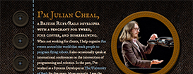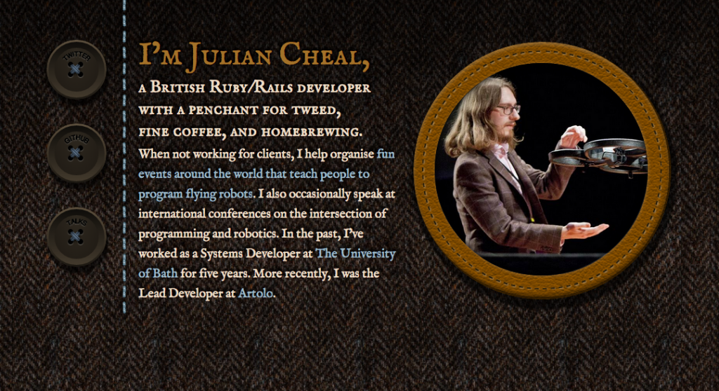 Этот вариант анимации был применен при создании сайта для Julian Cheal. К сожалению, он не отображается, как задумано, в браузере Internet Explorer. Кроме анимации, рекомендуем обратить внимание на кнопки-пуговицы на чистом CSS и кожаную рамку изображения. Подбор цветов сайта и твидовый фон создала Laura Kalbag.