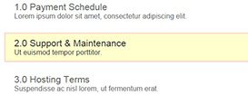 <h1>Website Contract</h1> <nav> <ul> <li><a href="#payment">Payment Schedule</a></li> <li><a href="#support">Support & Maintenance</a></li> <li><a href="#hosting">Hosting Terms</a></li> <li><a href="#glossary">Glossary</a></li> </ul> </nav> <article id="payment"> <h2>Payment Schedule</h2> <p>Lorem ipsum dolor sit amet, consectetur adipiscing elit.</p> </article> <article id="support"> <h2>Support & Maintenance</h2> <p>Ut euismod tempor porttitor.</p> </article> <article id="hosting"> <h2>Hosting Terms</h2> <p>Suspendisse ac nisl lorem, ut fermentum erat.</p> </article> <article id="glossary"> <h2>Glossary</h2> <p>Aenean id nibh eget nisl blandit hendrerit lobortis ac tortor.</p> </article>