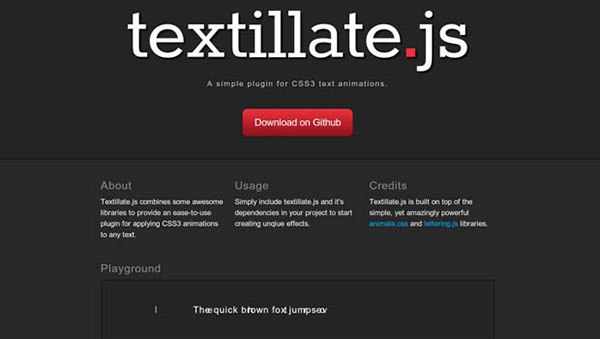 Textillate.js is — плагин, который использует в себе animate.css и lettering.js, для достижения эффекта анимации для текста. Доступно очень много разных вариации использования данного эффекта.