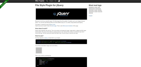 File Style Plugin for jQuery - браузеры не позволяют нам придавать стили формам загрузки файлов. File Style плагин исправляет эту проблему. Плагин позволяет нам использовать изображение для кнопки Обзор. Вы также можете придавать стиль к полю названия файла используя CSS. Плагин написан с использованием JavaScript и jQuery.