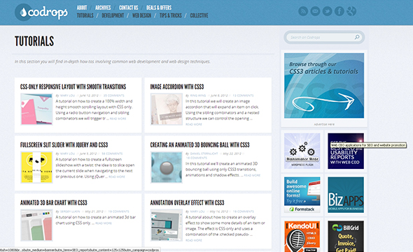 2. Css-tricks — пожалуй, самый популярный сайт с туториалами по css. Подкупает то, что большая часть уроков изложена в видео формате, а это существенно облегчает восприятие информации. Обратите внимание на раздел «Snippets» — здесь вы найдёте множество готовых решений.