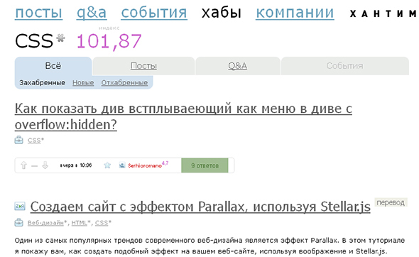 5. Хабрахабр — самый популярный русскоязычный ресурс для программистов и верстальщиков. В рубрике «css» вы найдёте много полезных статей и уроков на данную тематику.