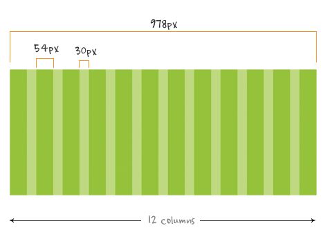 Сеточная система на 978 пикселей не использует ненужных правого и левого внешних отступов. В результате ширина области содержимого увеличивается на 38px. Интервалы между столбцами текста увеличиваются с 20px до 30px. Эта сеточная система также подходит для стандартного экрана разрешением 1024 точки, и столбцы могут быть разделены любым путем: 1/11, 3/3/3/3, 4/4/4, 3/9 и т. д.