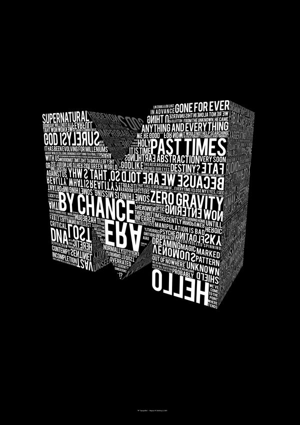 Сколько креативных и вдохновляющих работ можно создать при помощи типографики? В сети, мы часто всnречаем множество постеров, сайтов и манипуляций, созданных с использованием типографических элементов. Не так часто встречаются картины, созданные из самой типографики. Такие работы, чаще всего не несут в себе информации, как например постер с типографической надписью или сайт с логотипом, они являются художественным творчеством. А потому, несут в себе множество вдохновения, которое так необходимо любому дизайнеру.