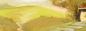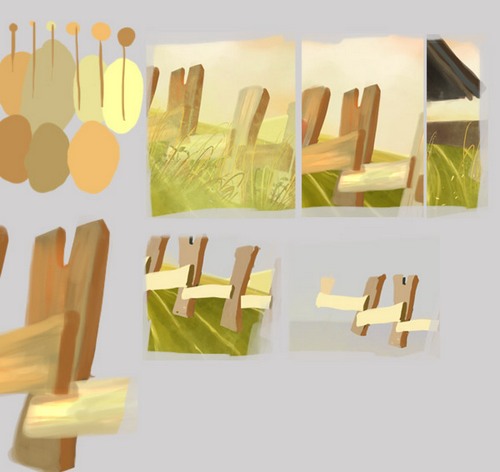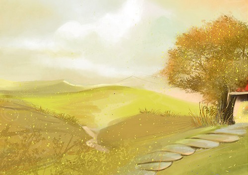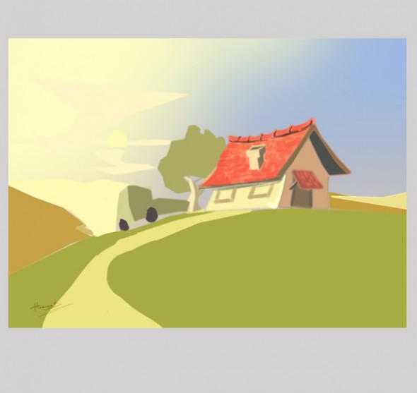 Я начала с наброска. Определившись с формами, я уделила внимание цветовой гамме, выделив основные и фоновые цвета. Для этого постарайтесь максимально точно представить себе картинку. На чистый лист Photoshop я набросала цветовых пятен. Не люблю работать на плоско залитом холсте — цветовые переходы помогают придать нужное настроение работе. Я добавила общую фоновую заливку. Видите, вышло много зеленой травы — на ум приходит старая добрая песенка про «...снится нам трава, трава у дома...» Попробуйте представить себя в таком месте: вон около домика растет тот дуб, на который вы часто взбирались в детстве...