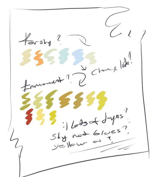 Определим основные цвета, с которыми будем работать. Вот моя палитра для этой иллюстрации. Как обычно, мне хочется нарисовать что-то поярче. Для фона я выбрала оттенки желтого и голубого. Остальные цвета — для пейзажа. Сохраните вашу палитру отдельным файлом. И пока будете рисовать, держите его под рукой открытым.
