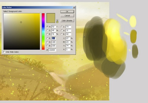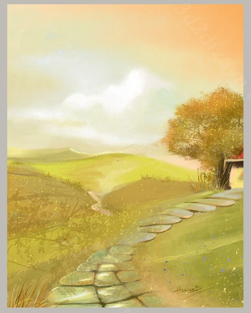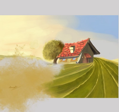 Я решила убрать старую машину, что сперва стояла около дома. Не так уж она и хорошо там смотрится. Машина — не обязательный объект на этой иллюстрации. Итак, машину я стерла, и прорисовала свой дуб — а вы, может, нарисуете другое дерево. Для этого я твердой круглой кистью наложила основные пятна красок, а затем схематически прорисовала детали той же кистью, но меньшего размера. Еще нужно создать отдельный слой для травы и ее тоже прорисовать в общих чертах.