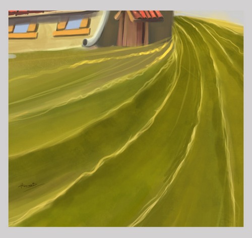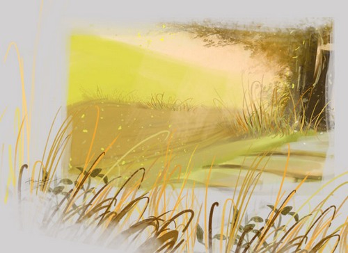 Продолжаем прорисовывать траву более детально, пользуясь как небольшой твердой кистью, так и сглаживая переходы мягкой. Впоследствии я смогу изменить траву, добавить цветы — красные, синие или желтые. Пока я об этом не думаю, но зелень травы точно придется кстати в этой иллюстрации.