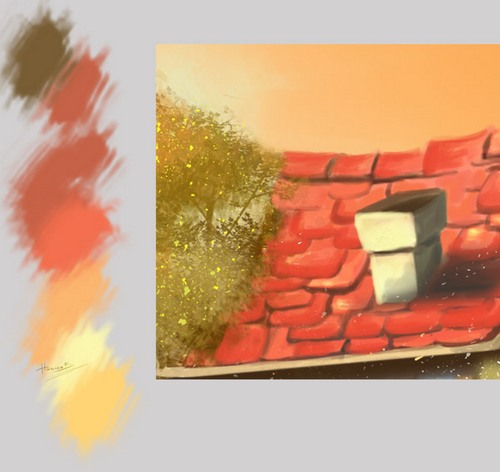 Прорисовываем детали маленькой кистью. Взгляните, как я работаю с деталировкой крыши: