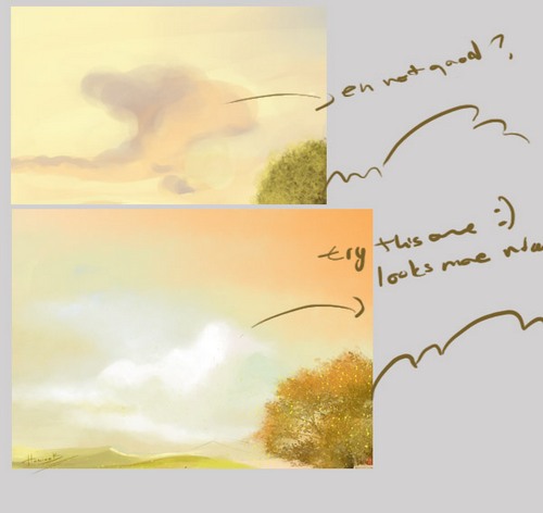 Небо у меня состоит из двух слоев: в одном — основные цвета, а в другом — все яркие места и просветы. Постарайтесь добиться гармоничности, изменяя форму кисти и рисуя облака разными мазками.