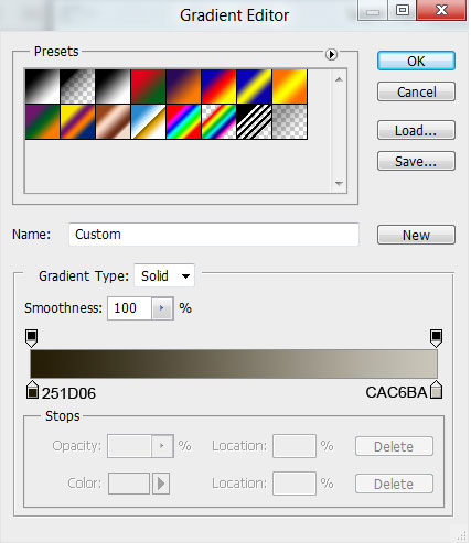 Настроим градиент: это будет радиальный градиент, по краям темнее (#251D06), а в середине посветлее (#CAC6BA).
