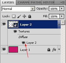 Нам нужно нанести узор на наш шарик. В панели слоев находим слой «Diffuse» и дважды кликаем по нему.
