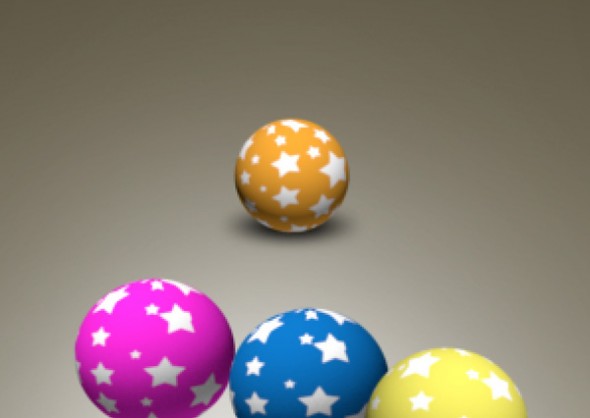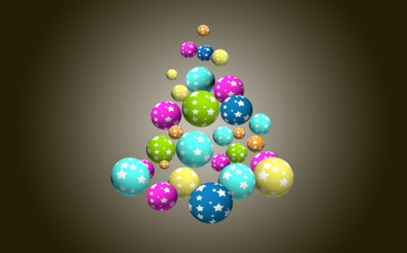 Таким образом мы можем создать по шарику нужного цвета. А можем копировать один, изменять цвет фона и вращать шарик инструментом 3D Object Rotate tool относительно оси Х. Здесь использованы цвета #EBA133, #FF2CDF, #EDE461, #95D301 и #5AF9EE. Затем мы продублировали шарики в нужном количестве и уменьшили их инструментом Free Transform (Ctrl+T). Для этого пришлось превратить копии из 3d объектов в смарт-объекты. Состтавьте из них композицию по своему вкусу.