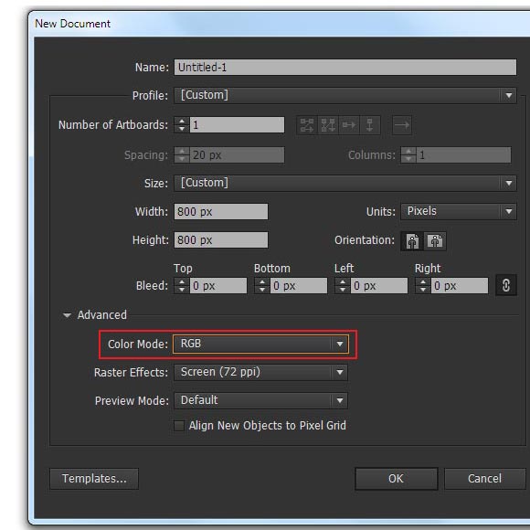 Откройте Adobe Illustrator, затем в меню выберите File > New/Файл>Новый. В открывшемся диалоговом окне выберите цветовой режим/color mode RGB, и укажите любые размеры рабочей области.