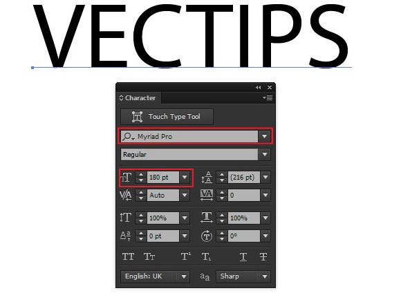 Возьмите инструмент Type/Текст (T) и введите любое слово заглавными буквами. В примере использован шрифт Myriad Pro размером в 180pt.