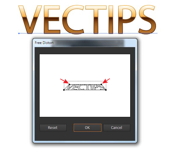 В меню выберите Effect > Distort & Transform > Free Distort/Эффект>Исказить и трансформировать>Свободное трансформирование. Переместите верхние уголки-манипуляторы вниз и ближе к центру, как показано на картинке ниже и нажмите OK.