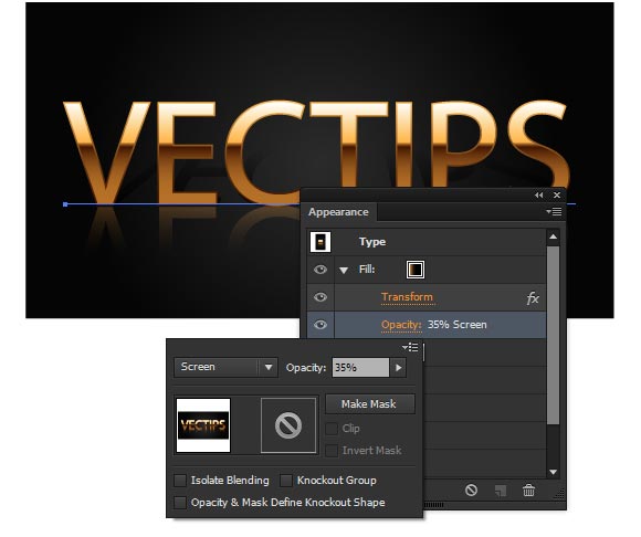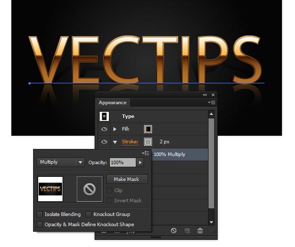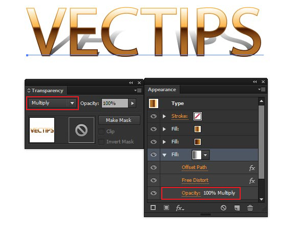 Укажите заливке режим наложения Multiply/Умножение. Вы найдете режимы наложения в палитре Transparency/Прозрачность или непосредственно в палитре Appearance/Оформление. В этом шаге мы создали тень от текста.