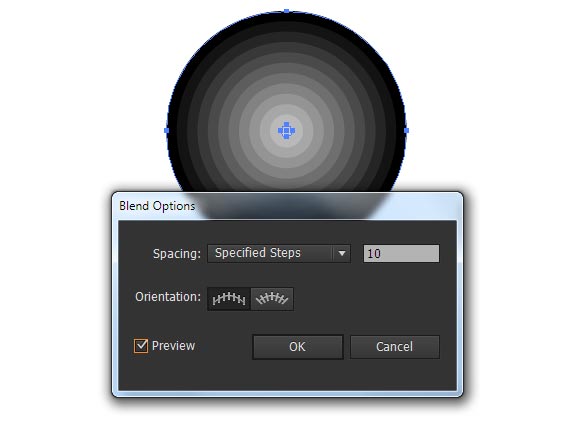 Выделите оба круга и в меню выберите Object > Blend > Make/Объект>Переход>Создать. Затем выберите Object > Blend > Blend Options/Объект>Переход>Параметры перехода и настройте параметры как показано ниже.