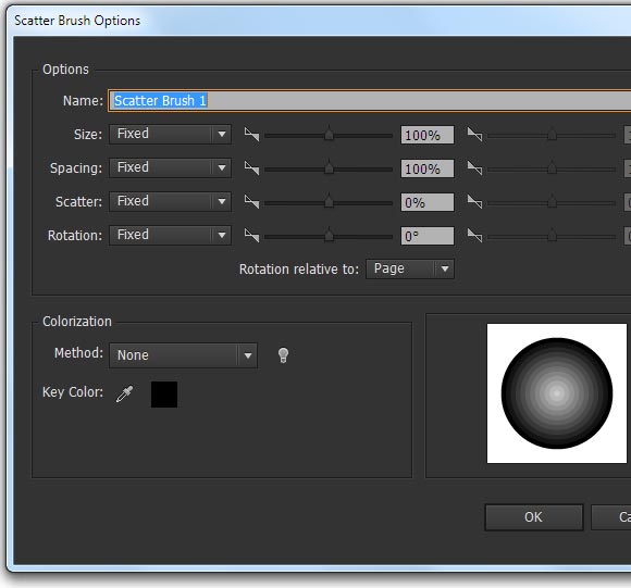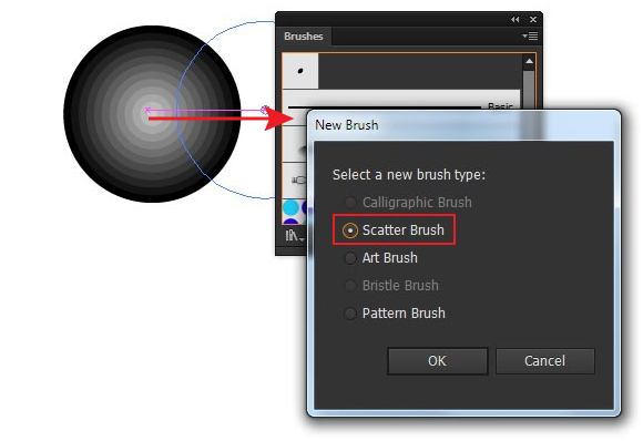 Перетащите получившейся объект в палитру Brushes/Кисти (Window> Brushes/Окно>Кисти). В диалоговом окне выберите Scatter Brush/Дискретная кисть.