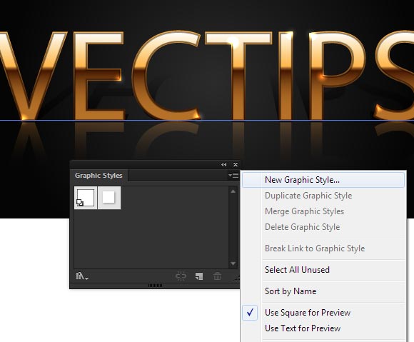 Теперь наш эффект готов. Нам остается только сохранить стиль графики. Откройте палитру Graphic Style/Стиль графики (Window > Graphic Style/Окно>Стиль графики),выделите текст, затем в выпадающем меню выберите New Graphic Style/Новый стиль графики.