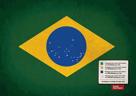 Постеры, следующие далее, были специально разработаны для политического журнала “Grande Reportagem”. Основная идея такой визуализации это превращение флагов разных стран в инфографику при помощи добавления легенды. Например: Соединенные Штаты Америки. Здесь красный цвет обозначает тех, кто за войну в Ираке. Белый: тех, кто против. Синий: тех, кто не знает, где находится Ирак.