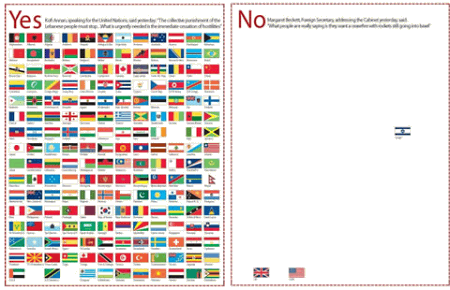 Средний Восток: кто за немедленное прекращение военных действий? Этот пример инфографики был опубликован на обложке журнала “Independent” во время кризиса на Среднем Востоке в Июле 2007 года.