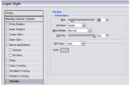Поработаем со свойствами слоя. Изменяют их так: не снимая выделения со слоя «лежачей» фотки (Layer 1), выберите Layer/Layer Style/Blending Options — или, что проще, дважды кликните по этому слою в панели слоев. Откроется окно настройки свойств слоя. Включите Stroke, чтобы создать рамочку вокруг фотографии. Толщину линии сделайте побольше, у меня — 24px, а цвет у меня серый, #CCCCCC.
