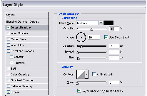 Здесь же, назначаем слою тень, Drop Shadow. Это добавит работе немножко глубины. Вот мои настройки: