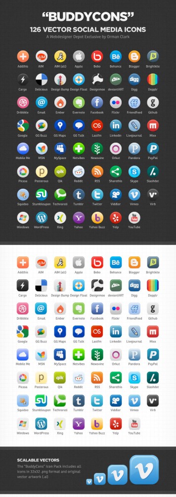 «High Detail Social Icons» и «Social Buzz Icon Pack» <<<---- самое оно!