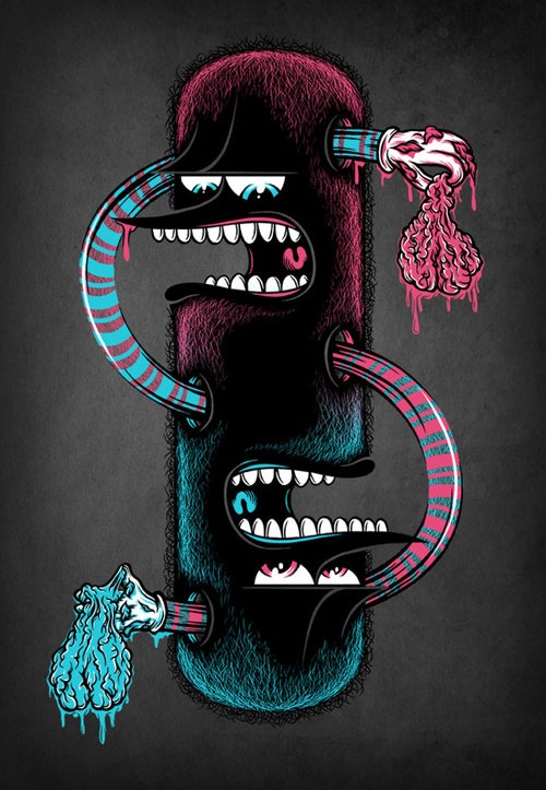 В портфолио этого художника, можно увидеть массу потрясающих хаотичных и несомненно вдохновляющих работ. Темные тона, но в тоже время красочные и игривые работы, созданы с таким творческим подходом, что не смогут оставить ни одного дизайнера безразличным.
