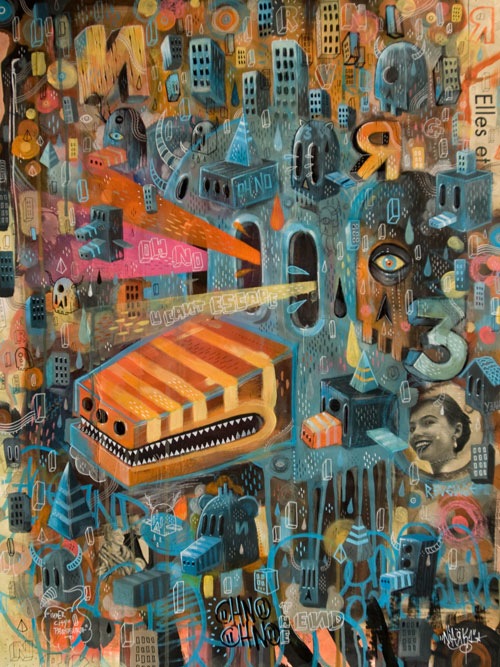 Не менее оригинальный художник из Франции. NIARK1 в своих работах использует сочетание акрила, ручки, аэрозольных баллончиков и сплетение изображений, размещая все это на деревянных панелях.