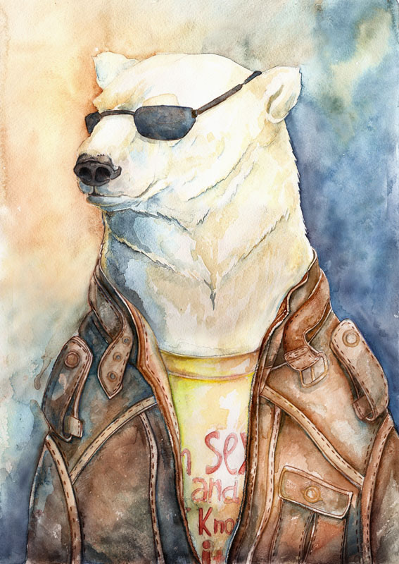 работа выполненная акварелью впечатлила, где мишка в кожанке