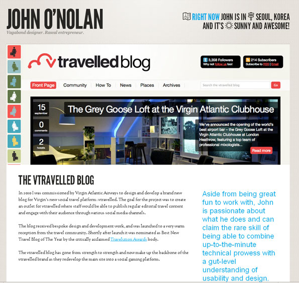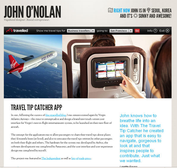 А насчет наивысшего подъема — сейчас я работаю с Virgin Atlantic, делаю для них действительно большой кусок работы, и это просто великолепно. У них довольно большая команда работает над новым разделом путешествий, и я полагаю, они внесут новую волну в сообщество ресурсов о путешествиях.