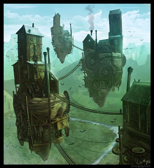 Круто! отличная подборка. Особенно впечатлили дома в воздухе (атмосферно и интересно), и еще больше — летательный аппарат (вижу написано «Голиаф»), там и настроение передано. Прям по Жюль Верну!)