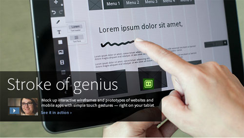 Adobe Proto – создавайте интерактивные каркасы и прототипы веб-сайтов и мобильных приложений. Приложение позволяет рисовать каркасы простыми движениями пальцем по экрану. По словам разработчиков, поддерживает CSS и jQuery, а также самые последние версии WebKit. Как и все Touch Apps, связан с Creative Cloud, позволяя вести коллективную разработку.