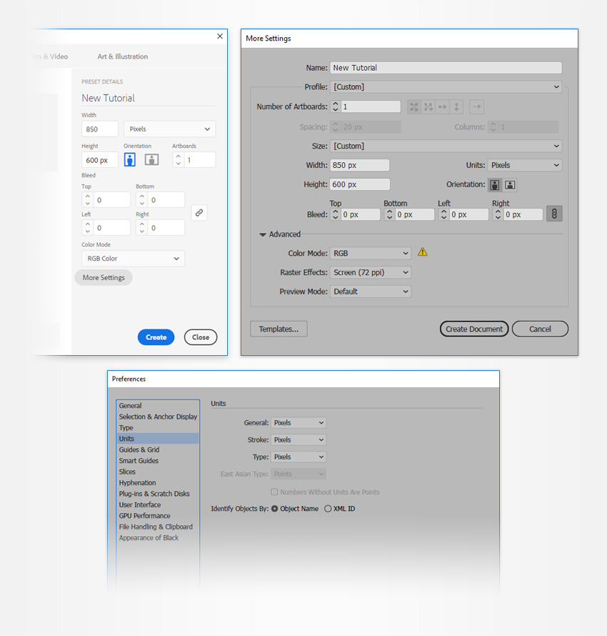 Нажмите Control-N чтобы создать новый документ. Настройте параметры документа как показано ниже и выберите в качестве единиц изменения пиксели.