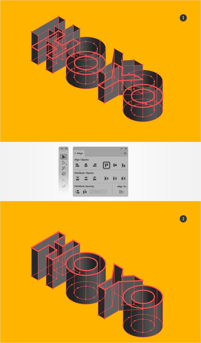 Инструментом Move/Перемещение (V) выделите 3D-текст серого цвета и оранжевый текст и выровняйте из вертикально по верху в палитре Align/Выравнивание.